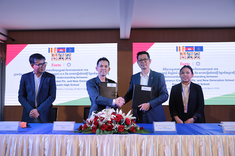 In a concerted effort to enhance the well-being of Cambodian families, Forte Life Assurance (Cambodia) Plc. and New Generation School Preah Sisowath High School have inked a significant strategic partnership agreement on March 28, 2024. This momentous occasion unfolded in the presence of esteemed leaders from both institutions, including Mr. Youk Chamroeunrith, Chairman of Forte Insurance (Cambodia) Plc., Mr. Prou Sythan, CEO of Forte Life Assurance (Cambodia) Plc., and Mr. Huot Seanghay, Vice Principal of New Generation School Preah Sisowath High School, at Preah Yukanthor High School.