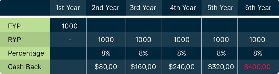- If more than 1 year renewal premium is paid, 8% cash back will apply to all advance premiums paid up to a maximum of 5 yearly premium or 40% of annual premium.