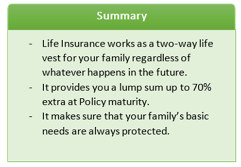 Their future depends on you. Who else could they depend on if you are not there or not able to earn anymore income? After all, you are the captain of the ship. Whether the ship reaches its goal or not depends solely on you. Life Insurance works as a two‐way life vest for your family regardless of what happens in the future. It provides you extra benefits when it matures and if you are not there, it makes sure that your family’s basic needs are met and helps protect them from financial difficulties.