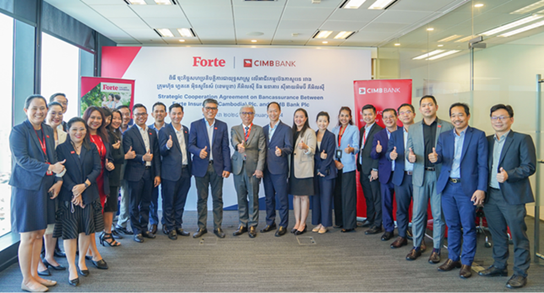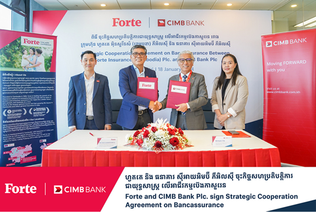 We are excited to announce the official signing of a Strategic Cooperation Agreement between Forte and CIMB Bank Plc on Bancassurance. This momentous event took place on Thursday 18 January, with the esteemed presence of Mr Youk Chamroeunrith, Chairman of the Board of Directors of Forte Insurance (Cambodia) Plc, Mr Bun Yin, Chief Executive Officer of CIMB Bank Plc, and the management teams of both companies.