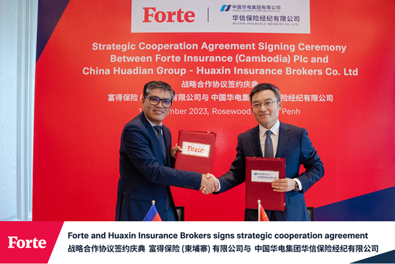 On November 14 2023, a Strategic Cooperation Agreement was signed between Forte and Huaxin Insurance Brokers, a subsidiary of China Huadian Group, one of China's largest state-owned power generation companies. The ceremony was presided over by Mr Youk Chamroeunrith, Group CEO of Forte Group, and Mr Zhao Yanlin, Executive Chairman of Huaxin Insurance Brokers, with management of both companies and distinguished guests in attendance.
