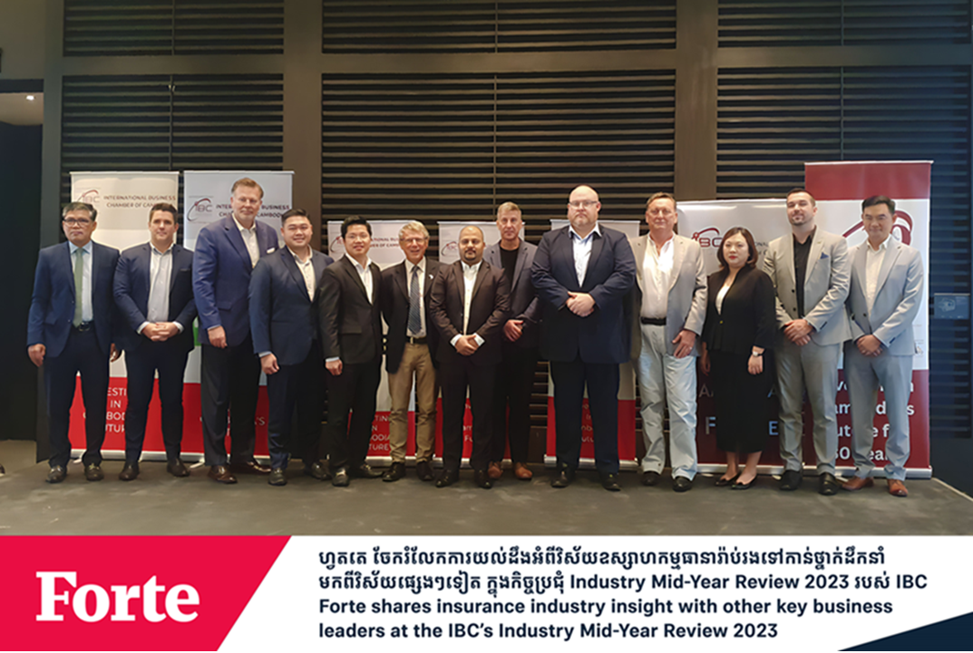 Phnom Penh: Forte was honored to have our Group CEO of Forte Group, Mr Youk Chamroeunrith, take part as a guest speaker in the Industry Mid-Year Review 2023 organized by the International Business Chamber Cambodia (IBC) on 5 July 2023. Mr Youk Chamroeunrith shared valuable insights and updates on the insurance industry, highlighting the current status and opportunities for growth with other key industry leaders.